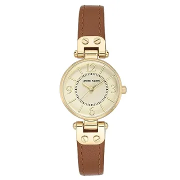 Show moreDiscover a brilliant blend of style and functionality with this exquisite Anne Klein women's watch. Featuring a 1 inch wide gold-tone case, this timepiece is designed to impress. The champagne dial elegantly showcases gold-tone hands and a black-printed inside minute track, offering a classic yet contemporary look. Its tapered brown leather band not only enhances its aesthetic appeal but also ensures a comfortable fit, secured with a reliable buckle closure. With an inner band circumference of 7.5 inches, it is perfect for a range of wrist sizes. Powered by Japanese quartz movement, this analog watch provides accurate timekeeping while maintaining a stunning appearance. Additionally, it is water-resistant up to 30 meters (99 feet), granting peace of mind against splashes and brief immersion in water, though it is not suitable for swimming or bathing. Anne Klein creates watches that embody both sophistication and utility, making this piece a must-have accessory for every modern woman.