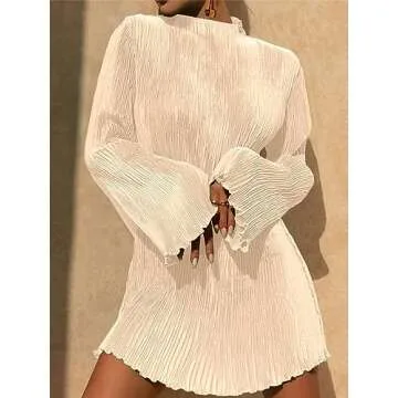 Annystore Women's Bell Long Sleeve Pleated Mini Dress Casual Mock Neck Ruffle A-line Shirt Dresses Cocktail Party Clubwear Apricot M