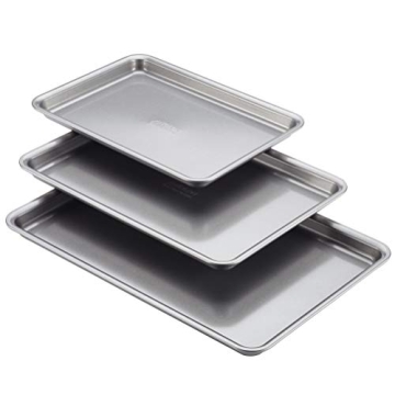 Show moreIntroducing the Anolon Gourmet Nonstick Bakeware Set, a quintessential addition to any kitchen that elevates your baking experience. This premium 3-piece set includes three essential cookie pans: a 9-Inch x 13-Inch, a 10-Inch x 15-Inch, and an impressive 11-Inch x 17-Inch. Designed with inside-out nonstick technology, these cookie sheets not only promise superb baking outcomes but also ensure that your baked goods release effortlessly, making cleanup a breeze. Crafted from heavy-gauge steel, this bakeware is built for endurance, enabling even heating for perfect browning with every use. The sleek graphite gray finish adds a modern touch to your kitchen essentials.