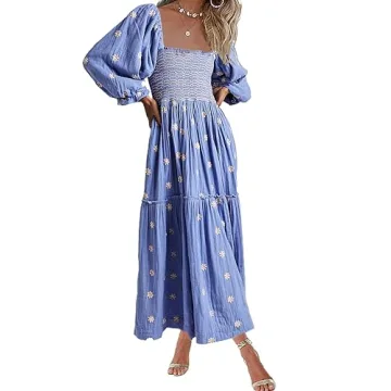 AnotherChill Women's Casual Embroidered Maxi Dress Floral Flowy Square Neck Dresses with Puff Sleeves for Summer 2023 (Blue, Large)