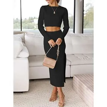 Show more Step into stylish elegance with the ANRABESS 2 Piece Outfit, designed specifically for the modern woman who seeks to blend comfort and chicness seamlessly. This captivating ensemble features a trendy long sleeve crewneck cropped top that offers a snug fit, perfectly accentuating the waist, and a stunning ribbed knitted midi dress adorned with a side slit, allowing for a tasteful glimpse of leg while ensuring movement is unhindered. Made from high-quality materials, this outfit not only promises comfort but also guarantees longevity, making it a wise addition to any wardrobe.