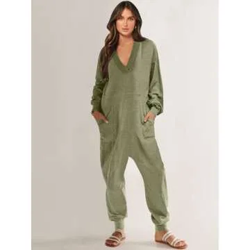 Show more Introducing an incredibly stylish and practical women's jumpsuit that beautifully combines comfort with fashion. This jumpsuit features a beautiful v-neck design, long sleeves, and a fashionable dropped crotch, perfect for those who appreciate a unique silhouette. Crafted from 100% rayon, the fabric strikes a perfect balance between warmth and breathability, making it an ideal choice for lounging at home or stepping out for a casual day. With two side pockets, you can easily keep your essentials close while exuding an effortlessly chic vibe. Whether you're looking to add to your pajama collection or seeking a versatile outfit for your daily adventures, this jumpsuit has got you covered.