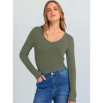 Show moreThe ANRABESS Long Sleeve V Neck Ribbed Knit Shirt is the epitome of style and comfort for the modern woman. Designed to enhance your wardrobe, this fall basic combines classic details with contemporary flair, making it a perfect companion for any casual occasion. The shirt is made from a premium blend of 93% rayon and 7% elastane, ensuring not only a soft feel against the skin but also excellent stretch and durability. Available in a stunning army green color, it's versatile enough to mix and match with your favorite high-waisted jeans or skirts.