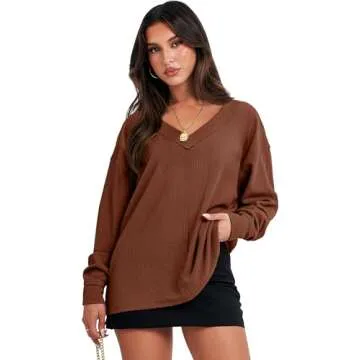 ANRABESS Oversized Long Sleeve Shirts for Women Off the Shoulder Sweatshirt Loose V Neck Tunic Tops High Low Sweater 2024 X-Large Caramel