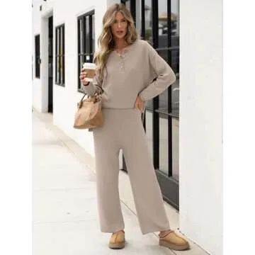 Show more The ANRABESS Women 2 Piece Outfits Oversized Loose Waffle Knit Sweater Set sets the standard for unbeatable comfort and effortless style. Crafted with a premium knit fabric, this essential lounge set features a chic oversized sweater and matching high-rise wide-leg pants, designed to provide the ideal combination of coziness and trendiness this fall. Experience the freedom of movement and the soft touch that comes with this luxurious fabric, making it a perfect addition to any wardrobe! Whether you're lounging at home, running errands, or dressing down for a casual outing, this versatile outfit seamlessly adapts to your lifestyle.