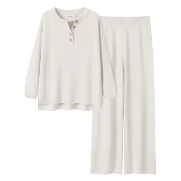 Show moreIntroducing the **ANRABESS Women 2 Piece Outfits Oversized Loose Waffle Knit Sweater Set**, a perfect blend of comfort and style for your fall fashion needs. This 2024 trendy matching lounge set, available in a chic white hue, is designed for versatility and ease, making it your go-to outfit for any occasion. The standout features of this set include a relaxed fit that is flattering across various body shapes and sizes, ranging from XS to XXL. The **crew neck** and **button design** on the top, along with its **dropped raglan sleeves** add a modern touch, while the **side slits** enhance breathability. Meanwhile, the high-rise, **elastic waistband** pants ensure a snug yet comfortable fit. Whether you wear them together or separately, this outfit truly allows you to express your personal style effortlessly.