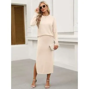 Show more Introducing the ultimate fashion staple that every woman needs in her wardrobe! This exquisite two-piece sweater skirt set is crafted from a premium blend of materials: 50% Viscose, 30% Nylon, and 20% PBT. The result? A soft, comfortable fit with just the right amount of stretch. Designed with versatility in mind, this set includes a cozy crew neck top with long sleeves that feature adjustable cuffs, making it ideal for any occasion. Paired with a midi skirt showcasing a flattering split hem design, this outfit promises to elevate your style effortlessly.