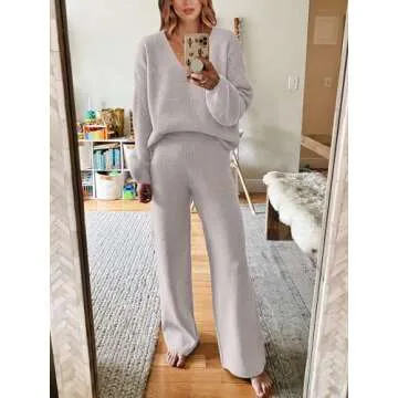 Show more Introducing the ANRABESS Women 2 Piece Outfits Sweater Lounge Sets! This chic and comfortable ensemble is designed for the modern woman who values both style and comfort. Crafted from a premium blend of 50% Viscose, 30% Nylon, and 20% PBT, this matching set offers medium stretch and a high softness level that feels heavenly against the skin. The set features a trendy long sleeve V-neck pullover top and wide-leg pants, making it perfect for various occasions, whether you're lounging at home, heading to work, or attending a casual gathering. Get ready to wow everyone with this simple yet fashionable outfit that complements your lifestyle effortlessly.