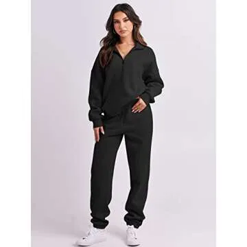 Show more Introducing the ANRABESS Women 2 Piece Outfits Sweatsuit, a trendy yet comfortable ensemble designed for the modern woman who values both style and practicality. This sophisticated tracksuit features a half-zip sweatshirt and jogger sweatpants, crafted from a premium blend of 50% Polyester and 50% Rayon that results in a fabric so soft, it feels like a gentle hug against your skin. Available in a versatile black, this set is perfect for any casual occasion or relaxed outing.