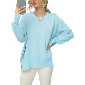 ANRABESS Women Crewneck Batwing Long Sleeve 2024 Fall Oversized Side Slit Ribbed Knit Pullover Sweaters Top Cozy Outfits Light Blue X-Large