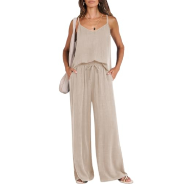 The ANRABESS Women's 2 Piece Linen Lounge Set is the epitome of summer fashion, combining style with comfort. Made from high-quality linen, this set is perfect for warm weather, featuring a chic spaghetti strap design and a flattering v-neckline. The tie-back feature adds sophistication, making it suitable for various occasions. The oversized fit and wide-leg pants enhance your natural curves while ensuring comfort. Elastic waistband and breathable fabric keep you cool, with sizing from small to extra-large....