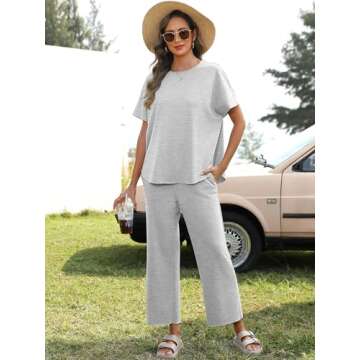 Show moreIntroducing the ANRABESS Women's 2 Piece Outfits, a quintessential addition to your summer wardrobe. This stylish ensemble features a chic 3/4 batwing sleeve top and versatile wide leg crop pants, designed specifically to elevate your casual looks without compromising on comfort. Crafted from a premium blend of 30% rayon and 70% polyester, this outfit promises a soft touch against your skin. It is perfect for beach outings, travel adventures, or leisurely lounging, ensuring you always look effortlessly fashionable.