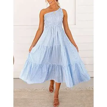 Show moreIntroducing the ANRABESS Women's 2024 Summer Bohemian One Shoulder Sleeveless Smocked Ruffle Tiered Beach Maxi Sun Dress, an essential piece for your warm-weather wardrobe! Crafted with the modern woman in mind, this exquisite dress blends stylish design with ultimate comfort, making it the perfect choice for sun-soaked days by the beach or lively outdoor gatherings. With its stunning stripe blue hue, this dress not only stands out but also complements a variety of skin tones, ensuring you look and feel fabulous wherever you go. Whether you're dressing up for a special occasion or looking for something chic for casual outings, this versatile maxi dress is designed to cater to all your fashion needs. Experience the joy of compliments and praise as you wear this dress that exudes elegance and charm!