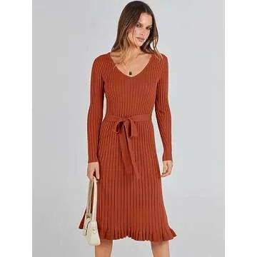 ANRABESS Women's 2024 Sweater Dress Long Sleeve V Neck Pleated Slim Ribbed Knit Fall Fashion Midi Dresses with Belt
