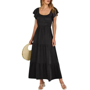 ANRABESS Women’s 2025 Summer Casual Maxi Dress Flutter Sleeve Scoop Neck Smocked Tiered A Line Flowy Beach Long Sun Dresses Black Medium