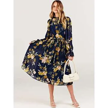 ANRABESS Women's Floral Midi Dress Puff Long Sleeve Casual Ruffle Chiffon A-Line Swing Pleated Belted Tea Party Dresses Floral Navy Small