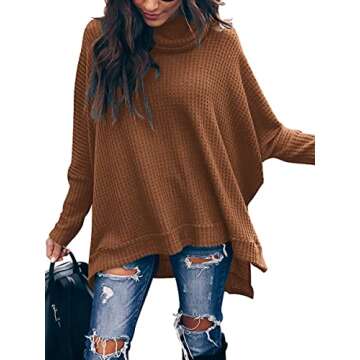 ANRABESS Women's Oversized Turtleneck Batwing Long Sleeve Waffle Knit Tunic Sweater Top 2024 Fall Trendy Pullover Shirts Caramel Small