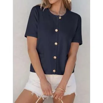 Show moreIntroducing the ANRABESS Women's Short Sleeve Cardigan Sweater, your new go-to for summer styling! This versatile cardigan is expertly crafted with a blend of 50% viscose, 30% nylon, and 20% PBT to provide a comfortable, breathable fit. The unique knit fabric showcases a classic crew neck design paired with a button-down front, making it perfect for layering over your favorite tops. Available in trendy striped or solid colors, this cardigan adds a refreshing touch to any outfit whilst accommodating a loose fit for enhanced mobility and comfort.