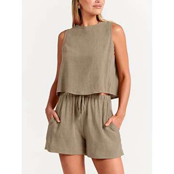 Show moreStep into summer with style and comfort with the ANRABESS Women’s Summer 2 Piece Outfit. Perfectly designed for warm-weather outings, this chic set combines a sleeveless crop top tank with high-waisted shorts, offering a flattering silhouette while allowing you to move freely. Crafted from lightweight, breathable fabric, this outfit is perfect for enjoying those sunny days, whether you are heading to the beach, brunching with friends, or lounging at home. With thoughtful features like spacious pockets, you’ll find this ensemble to be practical as well as stylish. The elegant khaki shade adds a touch of sophistication to your casual look, ensuring you stay trendy all summer long.