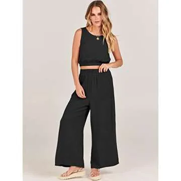 ANRABESS Women’s Summer 2 Piece Outfits Sleeveless Crop Top Tank and Wide Leg Pants Linen Jumpsuit Beach Vacation Sets Black Small