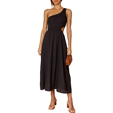 Show moreStep into summer with the ANRABESS Women's Summer Sleeveless Smocked One Shoulder Cutout Sundress, a stunning addition to your wardrobe that combines comfort with stylish flair. This alluring flowy A-line beach maxi dress, designed in classic black, offers versatility for any occasion. The unique one-shoulder design and elegant smocked bodice provide both support and a sophisticated silhouette, making it perfect for beach outings, garden parties, or casual afternoons. Crafted with quality in mind, this dress features a lovely lining to enhance its flow and ensure a flattering drape. You won't just look great; you'll feel confident and chic wherever you go.