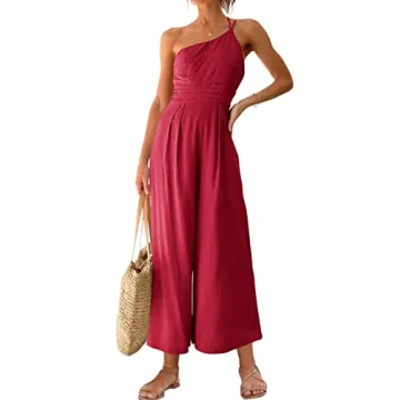 Show more Step into the spotlight with the ANRABESS Women's Summer Straps One Shoulder Pleated High Waist Casual Wide Leg Jumpsuit Romper, a fabulous and versatile piece that embodies comfort and elegance. This trendy jumpsuit is designed for the modern woman who values both style and practicality, making it ideal for various occasions—from casual brunches to formal weddings. The standout feature of this outfit is its unique one-shoulder design enhanced by two complementary spaghetti straps, creating a chic silhouette that draws attention. The high waist and pleated waistband are crafted to contour and flatter your figure, while the wide-leg pants offer ample movement and sophistication.