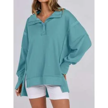 ANRABESS Women's Sweatshirts Oversized Casual Loose Button Up Henley Pullover Top High Low Split 2024 Fall Fashion Outfits Lake Green Medium