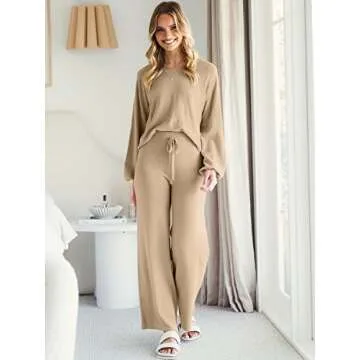ANRABESS Women’s Two Piece Crop Top & Wide Leg Pants Lounge Sweater Sets 2024 Fall Knit Sweatsuits Cozy Trendy Outfits Khaki Small
