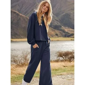 ANRABESS Women’s Two Piece Outfits Long Sleeve Crop Top Wide Leg Sweat Pants Knit Sweatsuit Fall Lounge Matching Clothes Set Blue Small