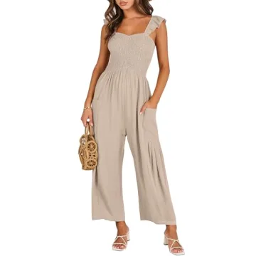 Show more Discover the perfect blend of comfort and style with the ANRABESS Women Summer Casual Dressy Sleeveless Smocked Wide Leg Linen Jumpsuit. This trendy travel outfit is crafted from a premium lightweight linen blend that offers breathability without compromising on durability. Designed for the modern woman, this jumpsuit features an elegant smocked bodice and wide leg cut, making it effortlessly chic for any occasion. The beautiful colors, including a stunning deep purple, add a vibrant touch that's perfect for summer outings or casual gatherings.