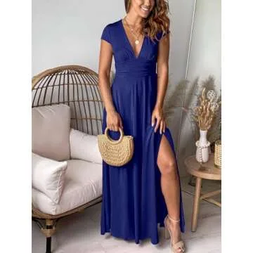 ANRABESS Women Summer Deep V Neck Short Sleeve Slit 2025 Elegant Formal Wedding Guest Cocktail Evening Date Maxi Long Dress Blue X-Large