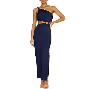 Show more Introducing the ultimate statement piece for every stylish woman: the ANRABESS Women Summer One Shoulder Sleeveless Maxi Dress. This enchanting dress in striking Navy Blue exudes elegance while its sexy bodycon fit ensures that you steal the spotlight at every event. Crafted by a trusted brand renowned for their dedication to fashion, comfort, and flair, this dress accentuates your curves beautifully. The design features a unique cutout waist and an eye-catching ring waist detail, making it an irresistible addition to your wardrobe.