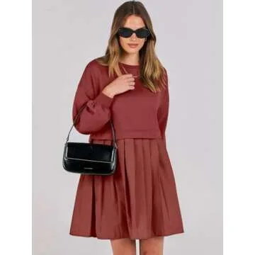 ANRABESS Women Sweatshirts Dress Oversized Long Sleeve Patchwork Casual Loose Pleated Pullover Mini Dress Fall Outfits 2024 X-Small Brick Red