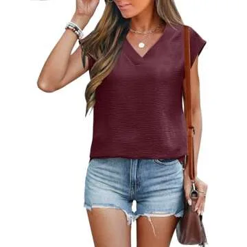 Show more Introducing the ANRABESS Women Tops Cap Sleeve Textured Dressy Casual V Neck Shirts, the ultimate addition to your summer business wardrobe. Designed with your comfort in mind, this elegant yet casual top features a flattering V-neckline and stylish cap sleeves, making it a versatile piece that can be seamlessly transitioned from office meetings to outdoor brunches. Made from 100% medium-weight polyester, it offers the perfect blend of softness and breathability, ensuring you stay comfortable throughout the day. Available in a beautiful burgundy shade, this blouse is designed to complement any outfit, whether you choose to dress it up with slacks or down with your favorite denim.