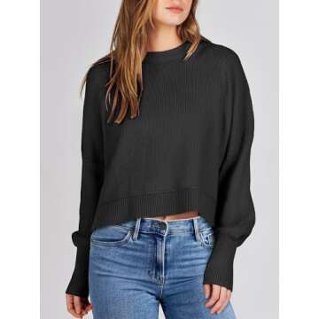 ANRABESS Womens Oversized Crewneck Cropped Sweaters Long Batwing Sleeve Side Slit Ribbed Knit Pullover Tops 2024 Fall Trendy Black X-Large