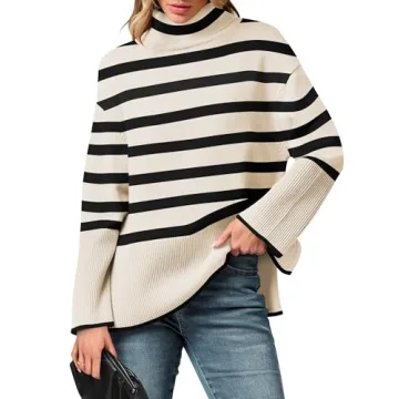 ANRABESS Womens Oversized Turtleneck Sweaters 2024 Long Sleeve Split Hem Knit Striped Pullover Sweater Top Casual Trendy Fall Outfits Black-Khaki Small