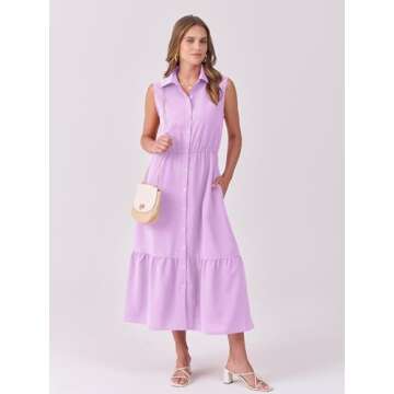 Show moreIntroducing the ANRABESS Womens Summer Button Down Shirt Dress, the perfect blend of style and comfort for your summer wardrobe! Crafted from 100% polyester, this lightweight maxi dress is designed for those sunny days when you want to look chic without compromising on comfort. The dress showcases a delightful sleeveless design paired with a classic collared neckline, effortlessly blending casual elegance with a touch of sophistication. Features like the easy-to-use button-down front and practical pockets make it ideal for daily wear, days at the beach, vacation adventures, or any event where you want to feel breezy and beautiful.