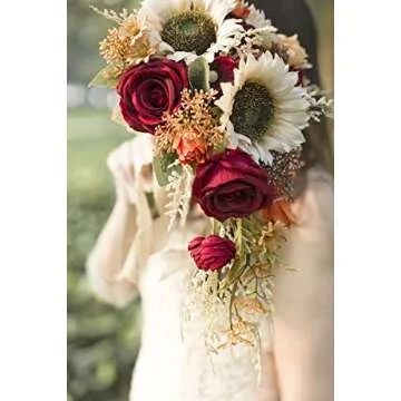 Ansofi 9 Inch Vintage Sunflower Wedding Bouquets for Bride Artificial Burgundy Rose Cascading Bridal Bouquet Burnt Orange Rustic Toss Bouquet for Wedding Ceremony Party Church Decor
