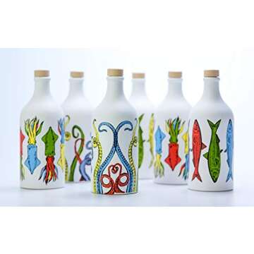 Antico Frantoio Muraglia, Premium Italian Extra Virgin Olive Oil, POP ART Collection Set of 2: Sardines and Cuttlefish, EVOO Collectible Handmade Ceramic Bottles 17 Fl.oz Food Gift Set