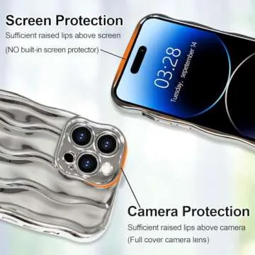 Anuck for iPhone 14 Pro Max Case Wavy Edge Water Ripple Pattern Design, Cute Wave Curly Frame Shape Soft Flexible TPU Shockproof Full-Body Protective Phone Case Cover for Women Girls, Shiny Silver