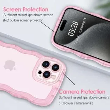 Anuck for iPhone 15 Pro Max Case Wavy Edge Clear Back Design, Anti-Slip Grip Cute Wave Curly Frame Shape Shockproof Soft TPU & Hard Bumper Protective Phone Case Cover for Women Girls, Clear Pink