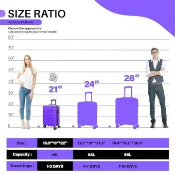 Show moreTraveling just got a lot easier with the AnyZip Carry On Luggage! This stylish 21-inch hardside suitcase, made from a durable ABS+PC composite, strikes a perfect balance between strength and flexibility, ensuring it can withstand the rigors of travel while maintaining its sleek appearance. Measuring at 15.7" x 9" x 22.2", it complies with airline carry-on regulations, allowing you to bring it onboard without the hassle of checking it in. The delightful violet purple color adds a touch of fun while making it easy to spot on the luggage carousel.