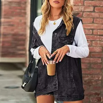 Anzber Women's Denim Vest Oversized Casual Classic Sleeveless Button Denim Jacket,Black,M