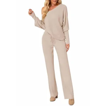 Show more Introducing the AOHITE Women's 2 Piece Knitted Outfit, your perfect blend of comfort and style. This stunning ensemble features a relaxed off-shoulder long sleeve pullover sweater paired with wide-leg pants that boast an elastic waistband. Designed with a chic boat neck, this outfit effortlessly combines a casual vibe with a fashionable edge, making it ideal for both lounging at home and hitting the town.