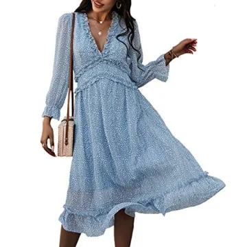 AOHITE Women's V Neck Ruffles Floral Printed Long Sleeve Dress High Elastic Waist Flowing Midi Dresses Blue M