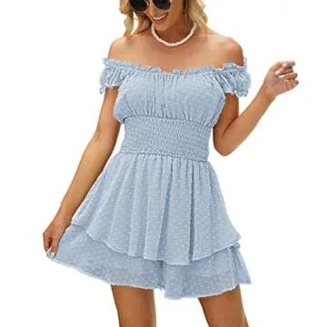 AOHITE Womens Summer Tube Top Dress Off-Shoulder Ruffled Flowy Mini Short Dresses Light Blue Large