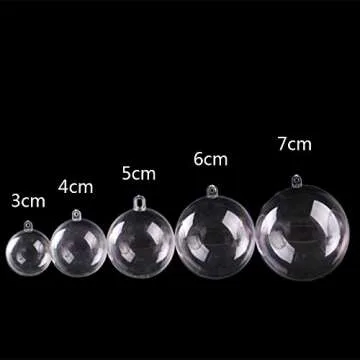 Show moreElevate your holiday decor and craft projects with the AOMGD 25 Set of 50 Pieces Christmas Clear Plastic Fillable Ornaments. Designed with creativity in mind, this set includes five different sizes—3cm, 4cm, 5cm, 6cm, and 7cm in diameter—offering versatility for all your decorating needs. Made from durable and food-grade plastic, these fillable ornaments are perfect for creating personalized gifts and festive decorations. Whether you're making holiday keepsakes, adding a whimsical touch to your party, or crafting unique ornaments for your Christmas tree, these clear plastic balls provide a blank canvas for your imagination.