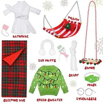 Show moreEmbrace the enchanting spirit of the holiday season with the Aoriher 9 Pcs Christmas Elf Doll Accessories Set. This delightful ensemble of 9 unique pieces includes everything your little one's elf could desire: a cozy plaid sleeping bag, an adorable white bathrobe, charming eyeglasses, an inviting red hammock complete with a pillow, a playful green doll face mask, a fluffy white scarf, snug ear muffs, a swing, and a festive green sweater. Each accessory is crafted with meticulous attention to detail and designed to elevate the imaginative play that is synonymous with Christmas traditions.