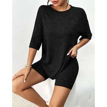 Aoulaydo Womens 2 Piece Lounge Set Summer Ribbed Knit Matching Outfits T-shirt Biker Shorts Casual Pajamas Set Black