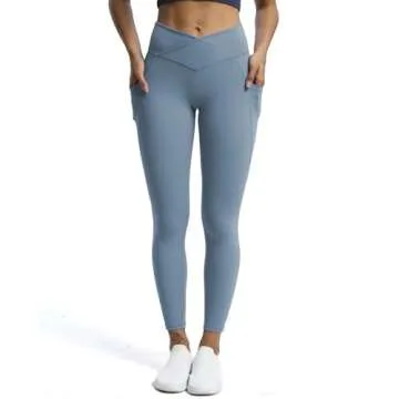Aoxjox Trinity High Waisted Yoga Pants with Pockets for Women Tummy Control Cross-Waist Buttery Soft Crossover Workout Leggings 26'' (Steel Blue, Small)